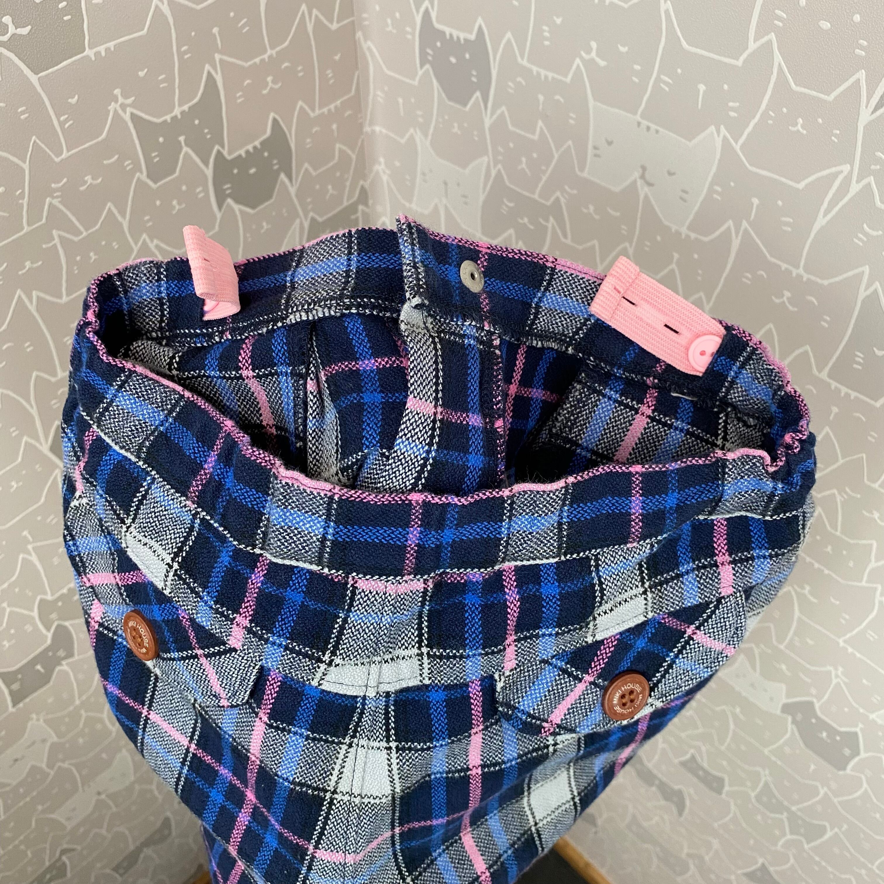 両腰内側にボタンでウエストサイズを調節できるゴムがついており、長くご愛用いただけます。